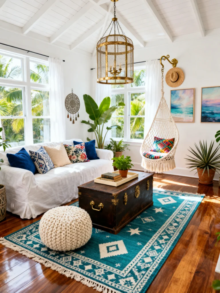 Okay, now we’re leaning into the bohemian side of coastal living, and I am here for it. This room feels like a world traveler’s hideaway in Bali or Tulum. That hanging macramé chair is an instant mood-booster—who wouldn’t want to curl up there with a book?