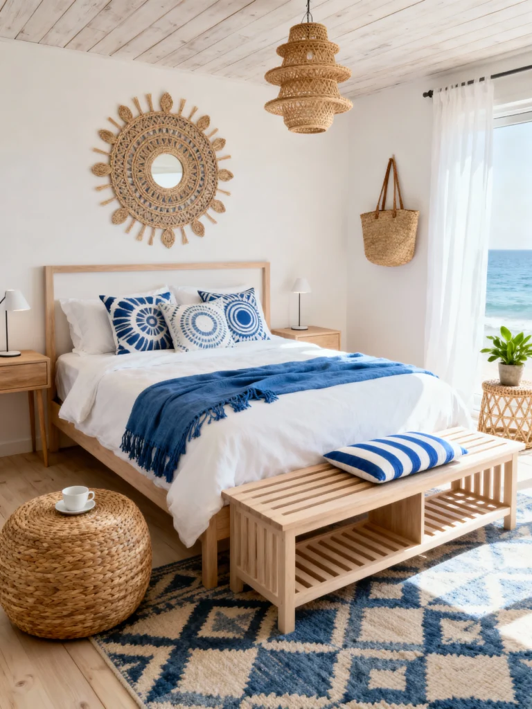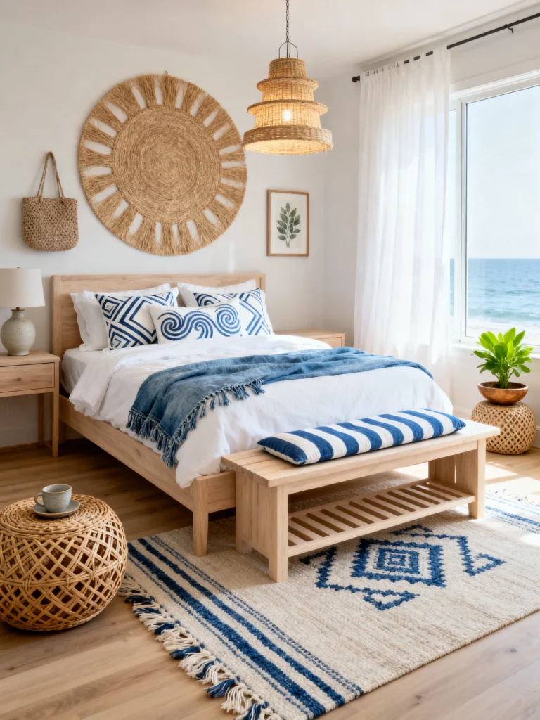 The focal point is definitely that massive woven sunburst wall hanging. It’s a great alternative to a traditional headboard and adds so much visual interest without using any “heavy” materials. The bedding keeps it classic with white linens and a denim-blue throw, but those wave-patterned pillows add a playful, artistic nod to the ocean just outside the window. It’s the kind of room where you’d wake up feeling refreshed before you even had your coffee.