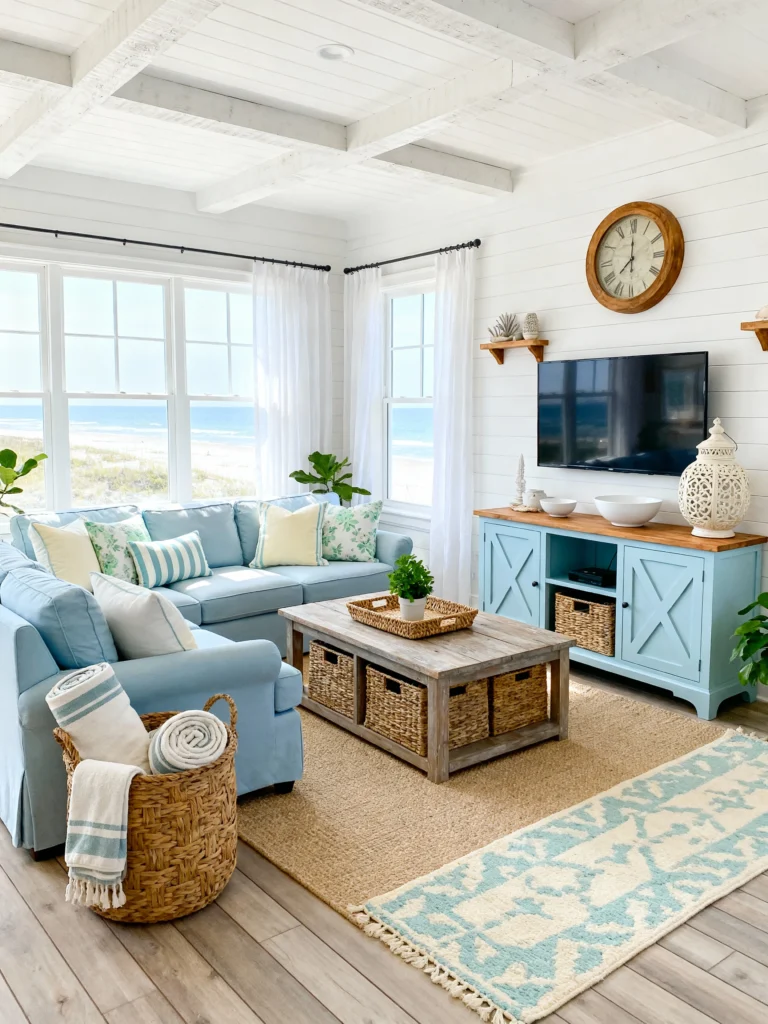 This is the quintessential “coastal cottage” look. The white shiplap walls and exposed ceiling beams create a bright, airy shell. What I love here is the pastel blue sofa—it’s softer than navy and feels much more relaxed.