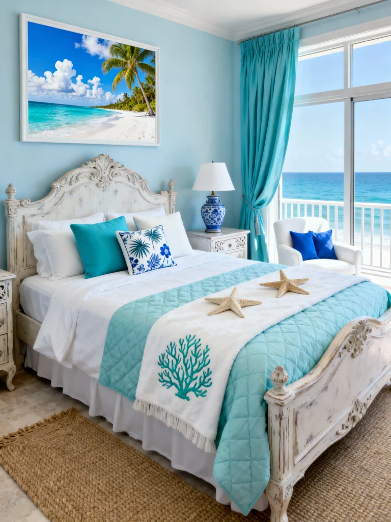 This bedroom leans into the more ornate side of coastal design. The carved whitewashed headboard gives the room a touch of “shabby chic” elegance. I love the specific shade of seafoam green used on the quilted bed runner—it’s incredibly soothing.