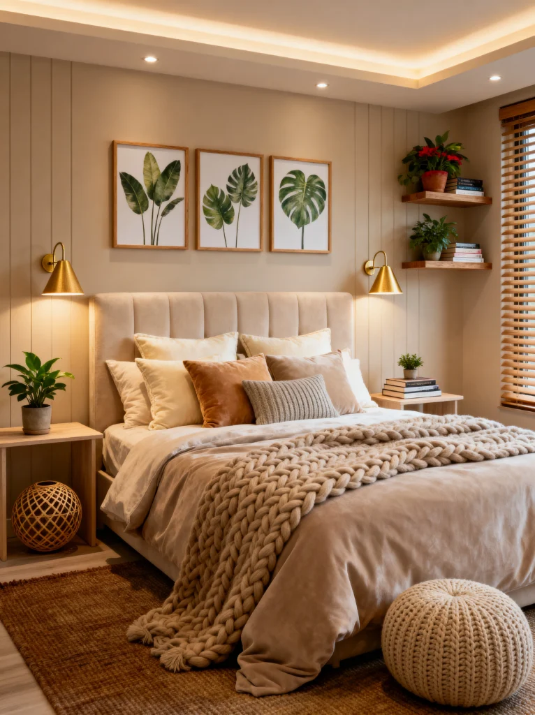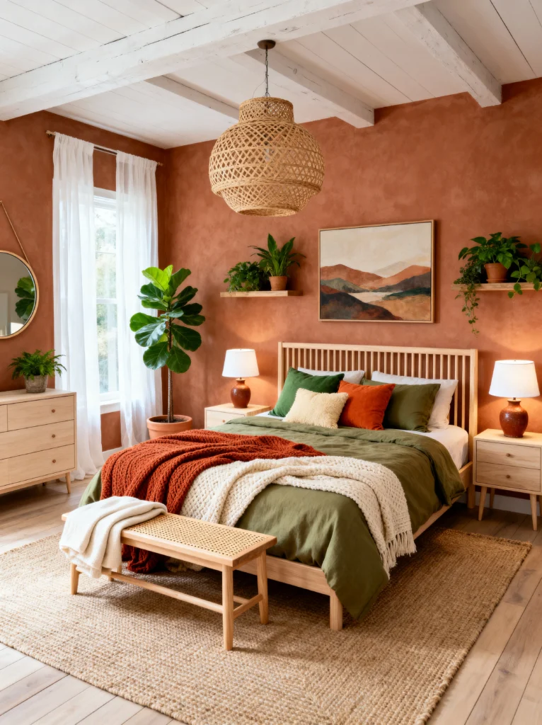 The bedding here is all about layering. You’ve got the crisp white base, a sage green middle layer, and that heavy rust-colored quilt on top, finished off with a chunky cream knit. It looks like a cloud you just want to dive into. The use of different botanical elements—the fern print on the left, the olive branch print in the center, and the actual olive tree by the window—creates a “botanical gallery” feel. It’s very peaceful. If you want a room that feels like a sanctuary where you can truly unplug from technology, this organic, plant-heavy vibe is the way to go.