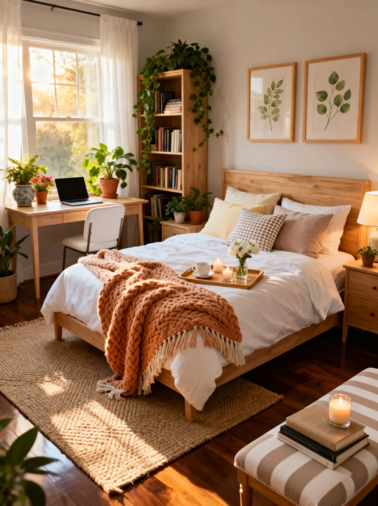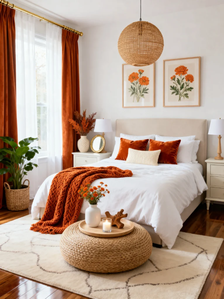 This is for my friends who love a clean, crisp aesthetic but don’t want their room to feel like a cold hospital wing. The white bedding acts as a blank canvas, allowing those burnt orange velvet pillows to absolutely sing. It’s a great reminder that you don’t need a total renovation to change your room’s vibe—sometimes, a new set of cushions and a matching throw are all it takes.