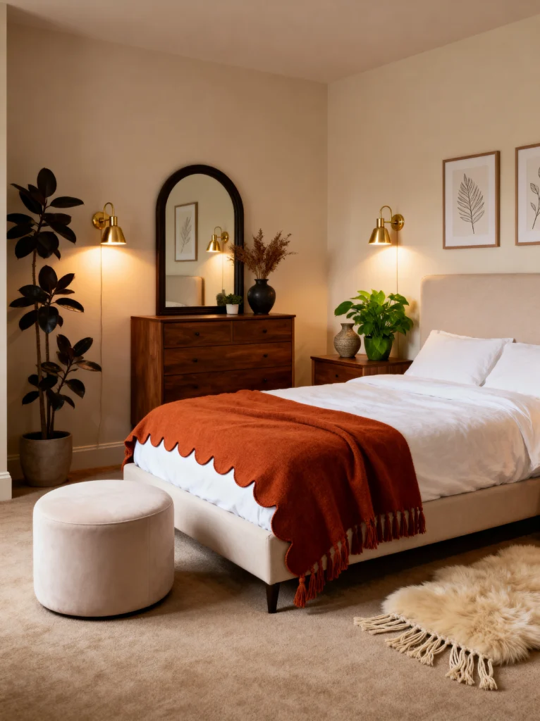 The brass sconces are a total game-changer. By mounting your lights on the wall, you clear up space on your nightstand for things that actually matter—like your current read or a cup of tea. Notice how the dark wood of the dresser matches the frame of the arched mirror? That’s a pro tip: repeating wood tones throughout the room creates a sense of harmony. The plush velvet ottoman at the foot of the bed adds a bit of luxury, and the sheepskin rug provides that “toes-on-a-cloud” feeling when you first get out of bed. It’s sophisticated, slightly moody, and very chic.