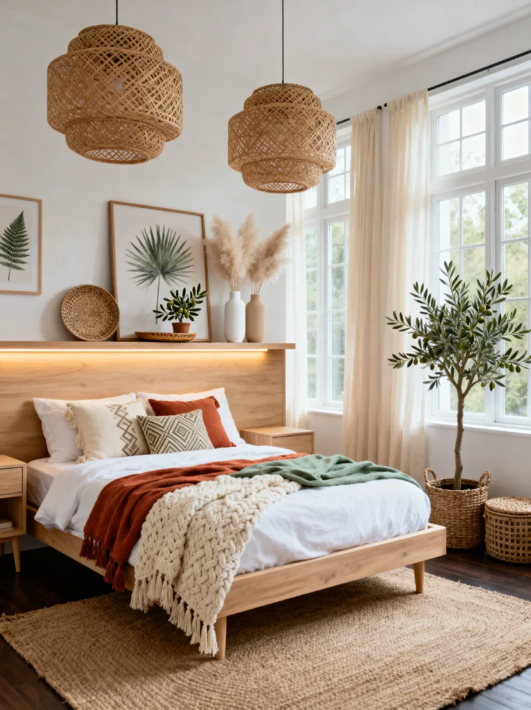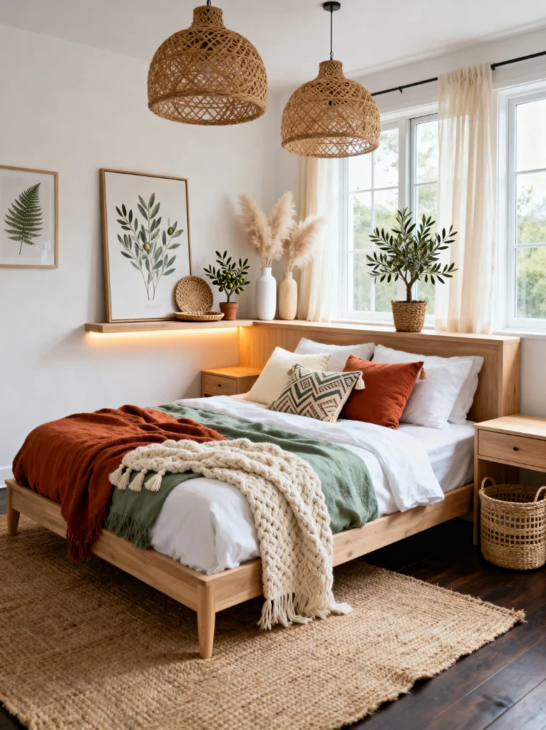 This is a variation of the “Elevated Boho” look, but it feels even more nestled and cozy. Look at how the wooden shelf wraps around the corner of the room. This is a brilliant solution for smaller spaces where you might not have room for two full-sized nightstands. It creates a continuous line that makes the room feel wider.