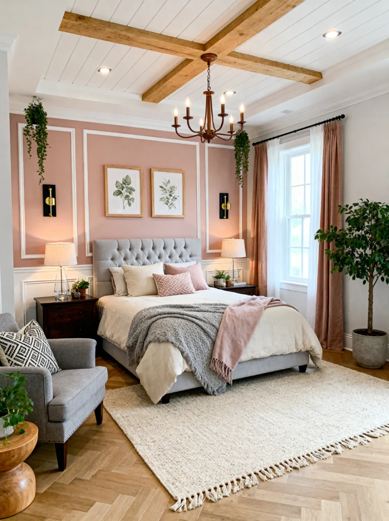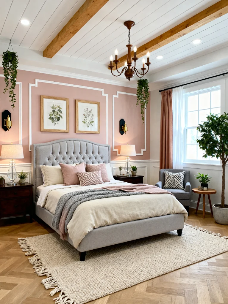 The tufted grey headboard adds a massive dose of texture and comfort—it basically screams “read in bed for three hours.” I also love the ceiling details here; the exposed wood beams against the white shiplap give it a modern farmhouse twist that prevents the room from feeling too “stiff.” The addition of the grey armchair in the corner creates a secondary zone—a little reading nook—which makes a bedroom feel like a true suite. The trailing ivy plants hanging from the ceiling add a nice pop of organic green against the structured pink walls. It’s a perfect blend of masculine (beams, dark wood) and feminine (blush tones, tufting).