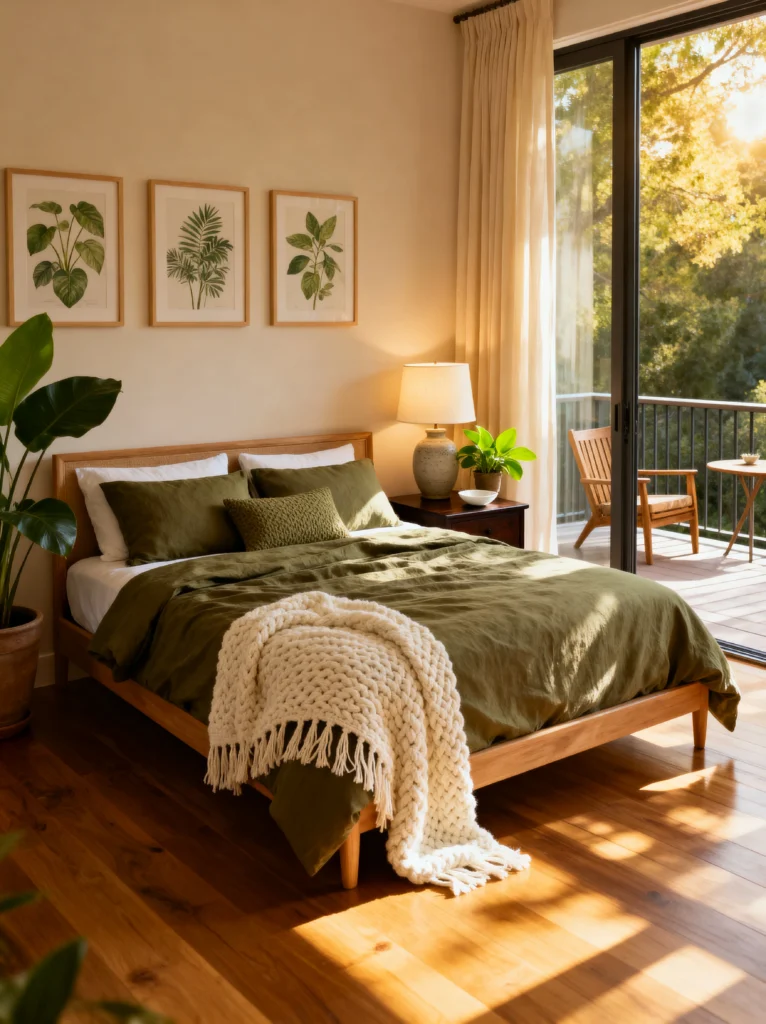 The linen bedding in that rich forest shade looks even better with a few wrinkles—it tells you the bed is meant to be lived in, not just looked at. I’m a huge fan of how the botanical prints on the wall mirror the actual plants in the room; it creates this seamless flow between art and nature. Plus, can we talk about that balcony? Having a sliding glass door right next to the bed allows all that gorgeous afternoon sun to hit the hardwood floors, making the whole room feel like a sun-drenched garden. It’s the ultimate “calm” aesthetic.