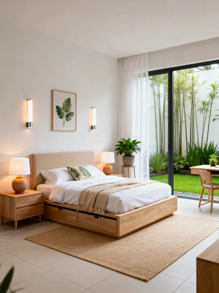 This is for my friends who believe that “less is more.” This space is pure Japandi vibes—a mix of Japanese functionalism and Scandinavian simplicity. The platform bed with built-in storage is such a smart move for keeping clutter at bay, which we all know is the secret to a better night’s sleep.