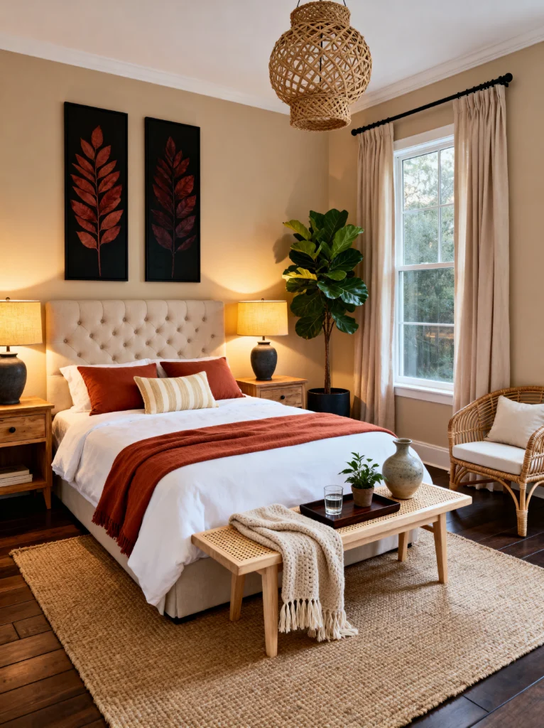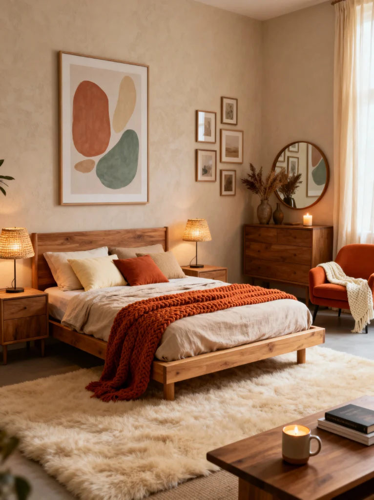 The real hero here is the lighting. Look at those matching wicker-shade bedside lamps—they cast such a soft, amber glow that makes the wood grain on the bed frame pop. And can we talk about the art? That large-scale abstract piece ties all the colors of the room together without being too “matchy-matchy.” If you want to recreate this, focus on textures. You’ve got a shaggy rug, a chunky knit orange throw, and smooth wooden furniture. It’s that mix of tactile surfaces that makes a room feel expensive and cozy at the same time. Don’t be afraid to lean into those warm, sunset tones; they’re scientifically proven to help you wind down!