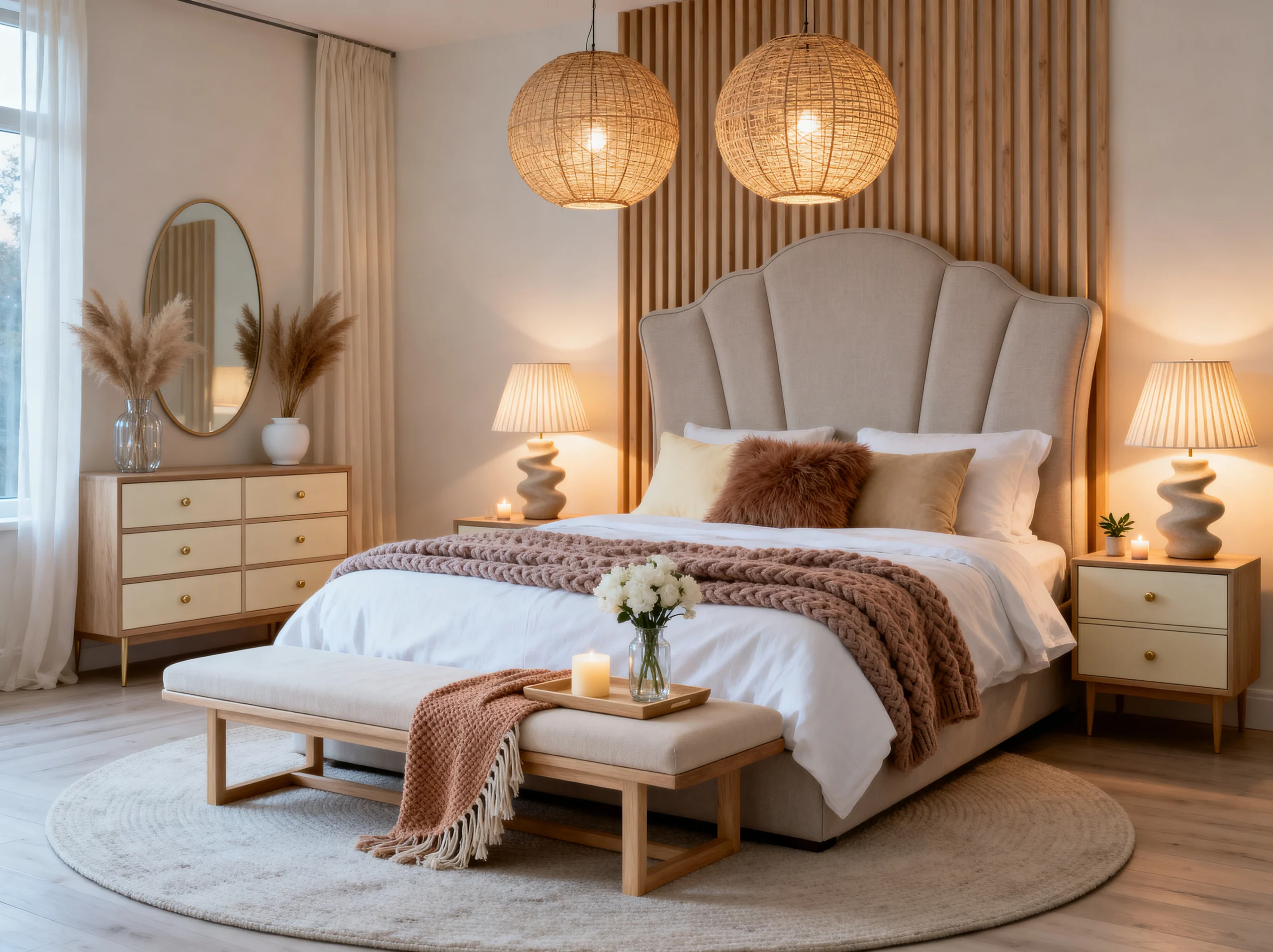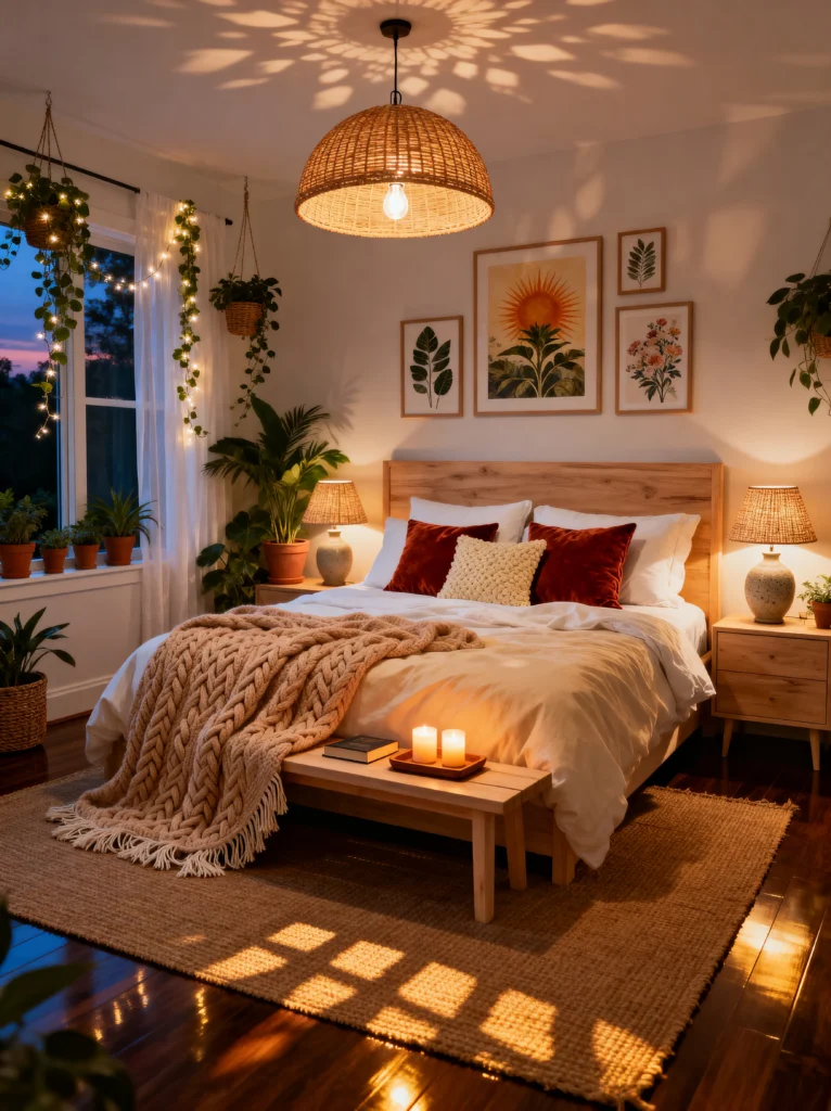 Okay, if magic was a room, this would be it. The lighting in here is absolutely everything! Between the oversized wicker pendant light casting those beautiful patterns on the ceiling and the flickering candles at the foot of the bed, the ambiance is a 10/10.