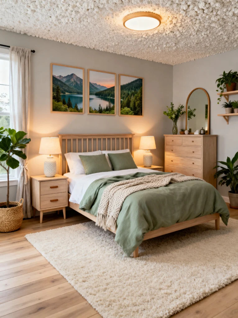 The highlight here is definitely the triptych of mountain landscapes above the headboard. It gives the room a sense of adventure and scale. Also, notice the ceiling—that “popcorn” texture actually looks quite cool when it’s clean and paired with a modern, flat-panel light fixture. It adds a bit of unexpected vintage charm. This is a great example of how to use a “cool” color palette (greens, whites, and light woods) to create a space that feels bright and energizing.