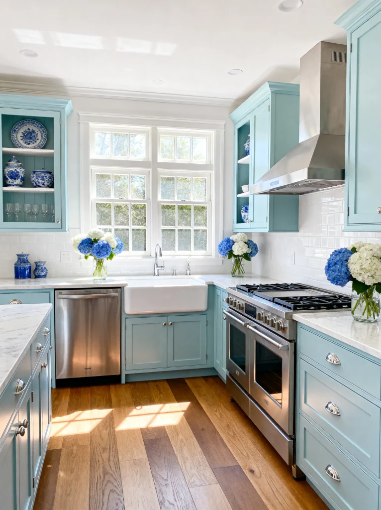 Have you ever walked into a room and felt like you could finally take a deep breath? That’s exactly what’s happening here. This kitchen is like a summer day at the beach, but without the sand in your shoes. Those soft, robin’s-egg blue cabinets are an absolute dream—they’re colorful enough to have a personality but light enough to keep the space feeling open and airy.