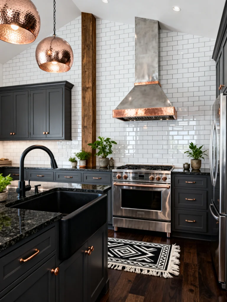 But the real stars of the show? The copper accents. That custom range hood with the copper trim is an absolute showstopper, and it ties in perfectly with the hammered copper pendant lights hanging over the island. I also love the addition of the natural wood beam and the potted greenery. It prevents the industrial elements—like the stainless steel appliances and black faucet—from feeling too “cold.” It’s a sophisticated, high-contrast space that feels like it belongs in a high-end city loft. Plus, that geometric rug adds a nice pop of pattern to the dark wood floors.
