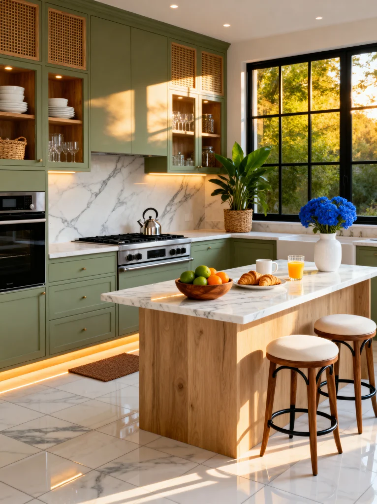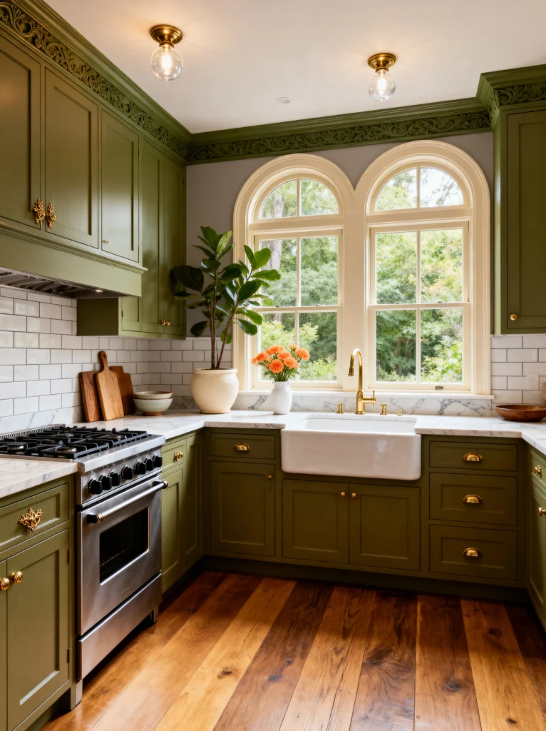 Have you ever walked into a room and just felt instantly calmer? That is exactly the vibe in this kitchen. The choice of olive or sage green for the cabinetry is such a bold move that pays off beautifully. It feels grounded and organic, especially when paired with those rich, warm hardwood floors.