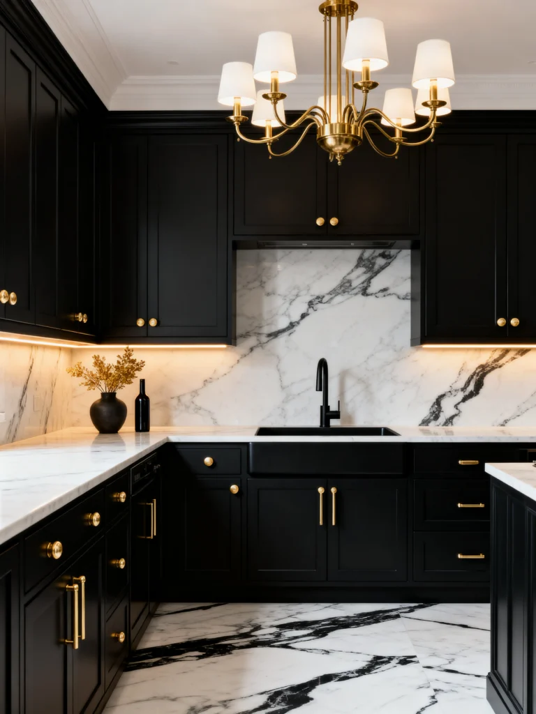 Can we talk about drama? Because this kitchen is bringing all of it. Going with matte black cabinets is a daring choice, but when you pair them with that high-contrast white marble, the result is pure luxury. The marble isn’t just on the counters; it’s the backsplash and even the flooring, creating a seamless, high-fashion look.