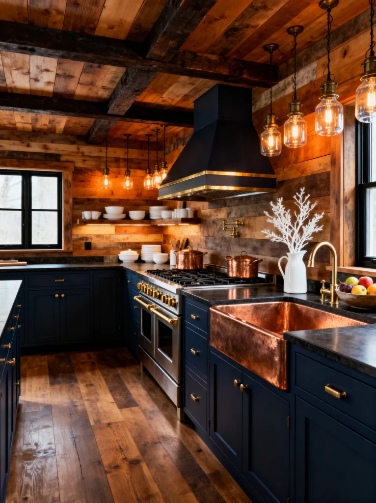 To keep it from feeling too much like a “wooden box,” they’ve used deep navy blue cabinets. It’s a genius color choice—it’s dark enough to feel cozy but provides a cool contrast to the orange tones of the wood. And let’s talk about that copper sink! A hammered copper apron sink is such a unique feature, especially when paired with those vintage-style Edison bulb pendants. With the copper pots on the stove and the soft glow of the lighting, this kitchen feels like the warmest, most inviting place on earth on a cold winter day.