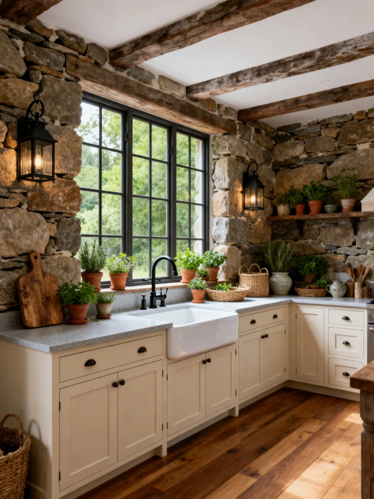 The black hardware and black-framed windows provide a sharp, modern contrast to the rugged stone and the chunky wooden ceiling beams. I also love the “indoor garden” vibe happening on the windowsills. All those terracotta pots with fresh herbs make the space feel lived-in and loved. It’s a perfect mix of “rough” and “refined.” It’s the kind of kitchen where the floor is a little uneven, the wood is a little weathered, and that’s exactly what makes it perfect.