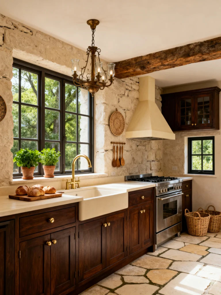 The flooring here is spectacular—large, irregular flagstones that make you feel like you’re standing in an ancient villa. The gold bridge faucet and the delicate chandelier add a touch of elegance to an otherwise very rustic space. It’s a “chef’s kitchen” through and through, with plenty of counter space and a high-end range, but it never loses that soulful, historic feeling. It’s a masterclass in using natural materials to create a space that feels both expensive and completely unpretentious.