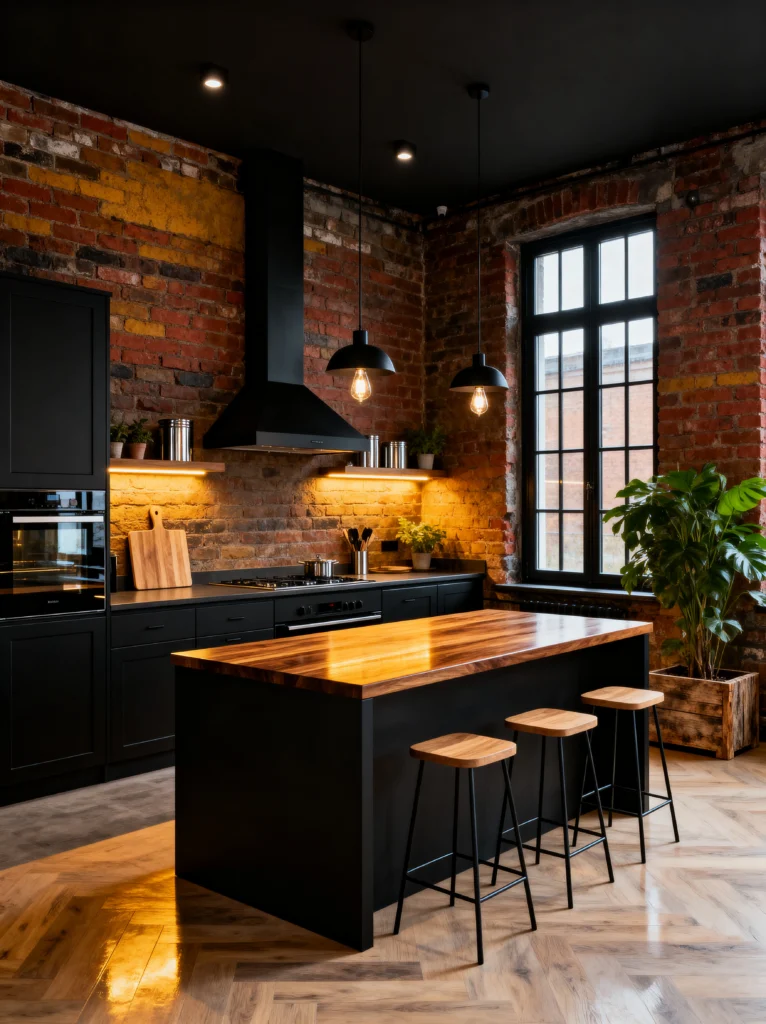 Okay, let’s flip the script. If the last kitchen was a breezy morning, this one is a cool, moody evening in a downtown loft. This space is all about texture and contrast. You’ve got these incredibly sleek, matte black cabinets and a black ceiling that should feel heavy, but because of the exposed red brick, it feels totally balanced and warm.