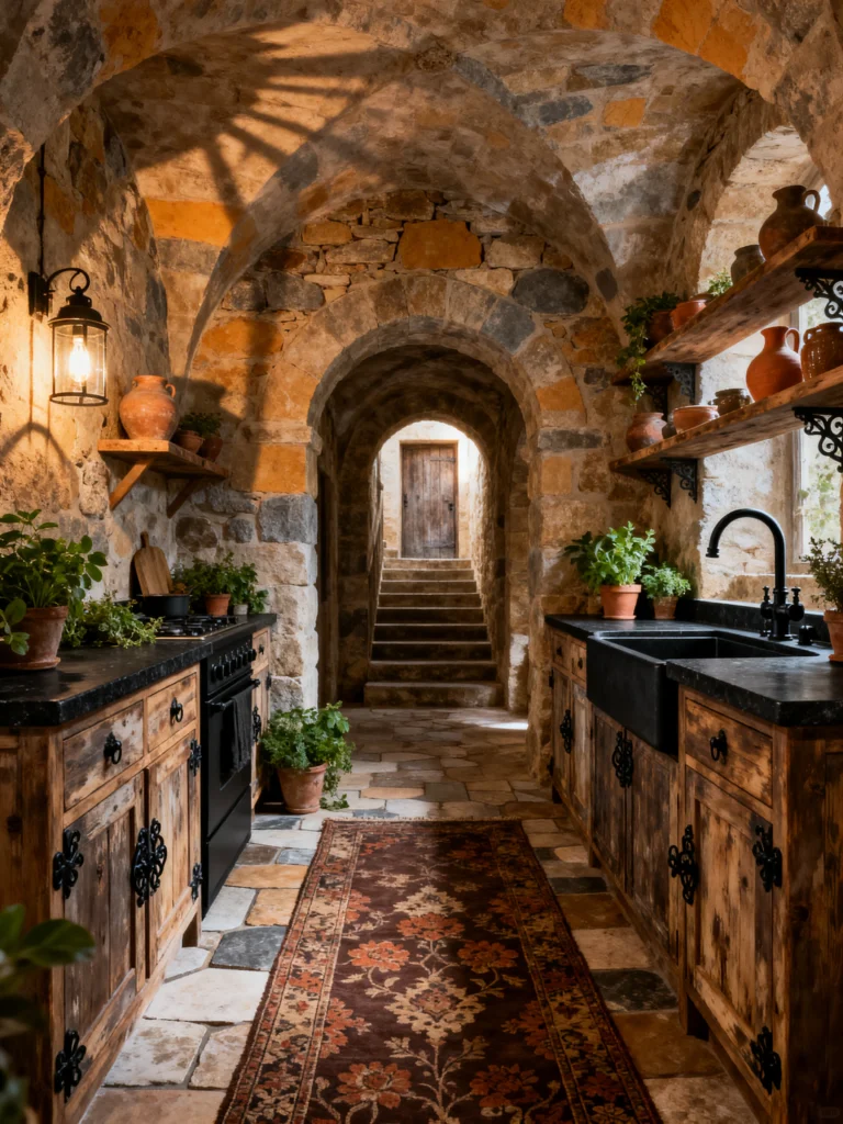 What I love is how they’ve paired those ancient-looking stone walls with really rustic, reclaimed wood cabinetry. It looks like it’s been there for centuries, yet the black countertops and modern black faucet keep it from feeling like a museum. The terracotta pots and the ornate rug add these little pops of warmth and life. It’s a narrow space, but the “galley” style makes it feel like a cozy, secret grotto. This is a kitchen for someone who values storytelling and soul in their home—a place where recipes are passed down through generations.