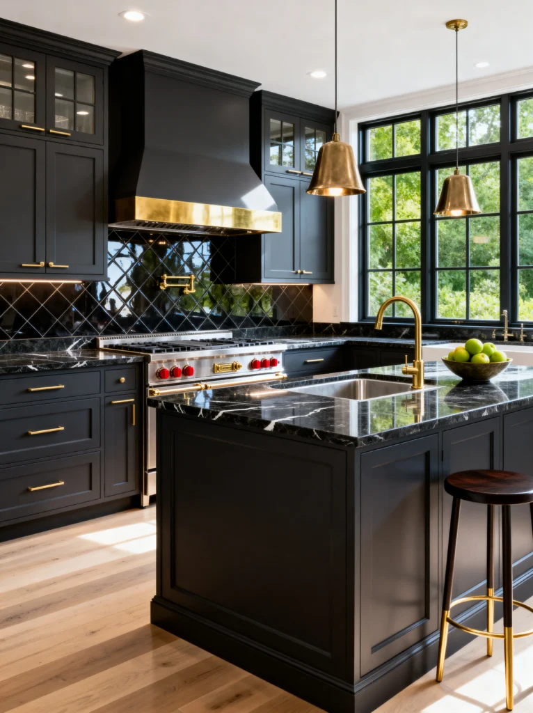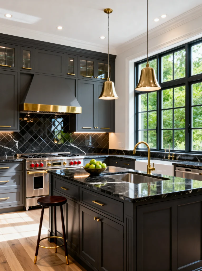 If you want your kitchen to say “I’ve arrived,” this is it. This is high-end drama at its finest. The combo of the charcoal-black cabinetry and the gold hardware is just… chef’s kiss. It’s sophisticated, expensive-looking, and incredibly sharp.