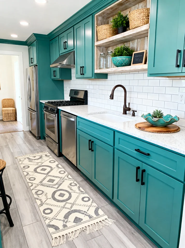 To keep the teal from taking over the world, they’ve paired it with a bright white speckled countertop and a classic white subway tile backsplash. It’s a great lesson in color theory: if you go big on the cabinets, keep the rest of the surfaces simple. The natural wood accents in the open shelving and the wicker chair in the corner add a bit of warmth so the teal doesn’t feel too “cool.” And that patterned runner on the floor? It ties the whole room together perfectly. This kitchen is vibrant, cheerful, and full of personality—definitely not your average cookie-cutter space!