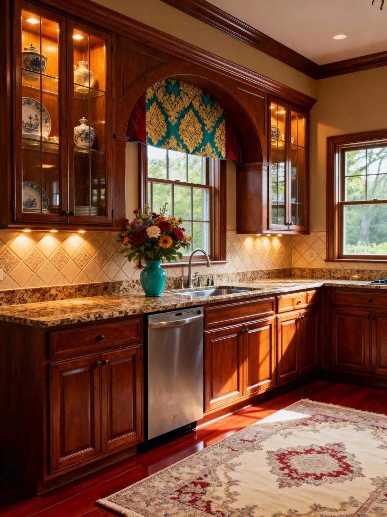The granite countertops with their warm, earthy tones pull in the colors from the wood, and the under-cabinet lighting makes the whole workspace feel warm and inviting. I love the glass-front cabinets with the integrated lighting; it’s the perfect way to show off your favorite dishes without them getting dusty. The ornate rug and the damask-patterned valance add a layer of soft texture that makes the room feel more like a “living” space than just a utility room. It’s a kitchen that feels stable, comfortable, and very high-quality. It’s a classic for a reason!