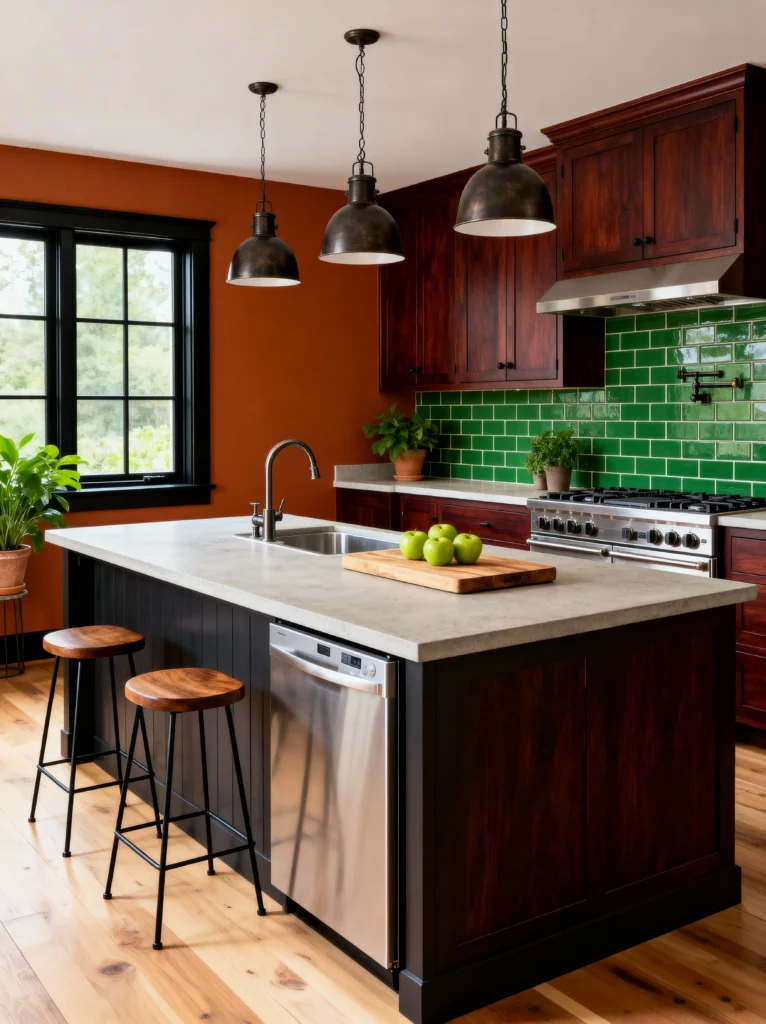 The island is the real MVP here. It’s massive, topped with a cool gray stone that balances out all that warmth. Those wooden bar stools with the slim black legs are perfect—they add a bit of an industrial touch without being “too much.” And let’s talk about the green backsplash! Using a vibrant forest green subway tile against an orange wall is a classic complementary color move that makes both colors pop. It’s a kitchen that feels both modern and timeless.