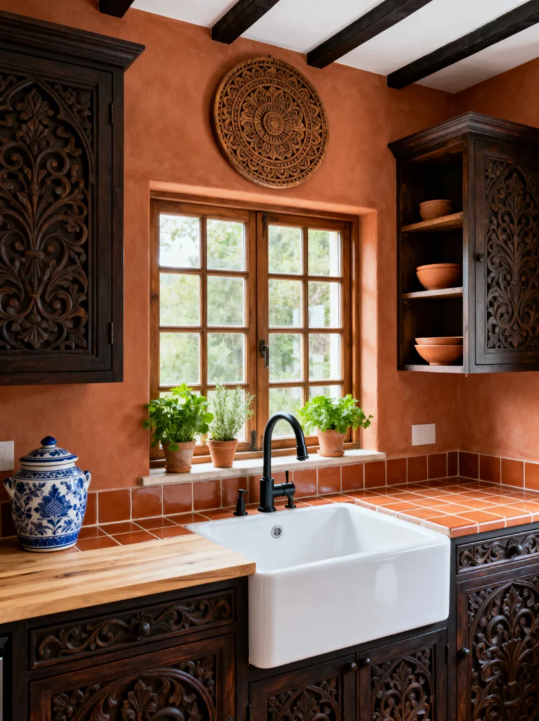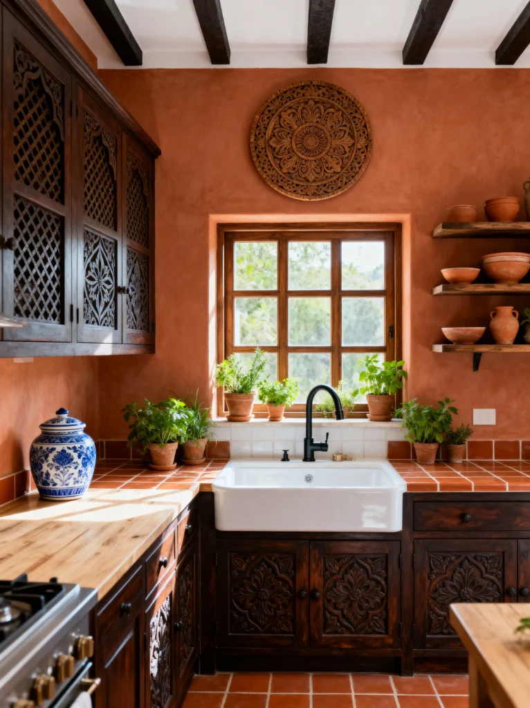 The walls are a beautiful, textured plaster in a soft burnt orange, which creates a really earthy, “old world” feel. I love the open shelving on the right; it’s the perfect place to display terracotta bowls and jars, keeping the vibe consistent. The large circular wood carving above the window is such a clever way to add decor without cluttering the workspace.