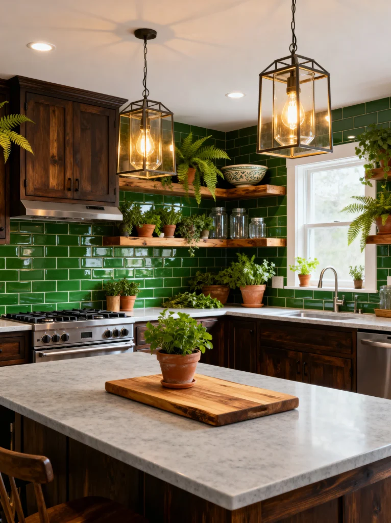 If you love the feeling of being in a greenhouse, this is the kitchen for you. Can we talk about those emerald green subway tiles? They are bold, glossy, and absolutely stunning against the dark wood cabinets. Often, people are scared to go this dark with both tile and wood, but the secret here is the crisp white grout and the bright marble countertops. They act like a highlighter for the whole room.