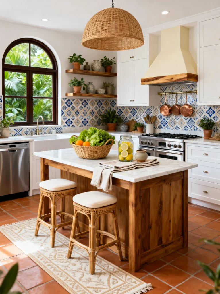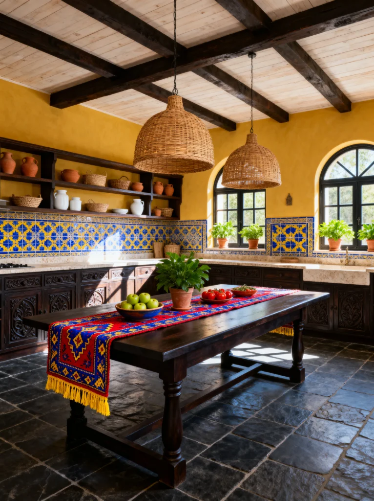 The scale of this room is amazing—those giant wicker pendant lights over the long wooden table make the space feel grand yet approachable. This isn’t just a kitchen; it’s a gathering place. I love the use of the colorful runner on the table; it ties the blues and reds from the tile work right into the center of the room. If you have high ceilings and big windows, going bold with a primary color palette like this can turn a “cooking area” into the heartbeat of your entire house.