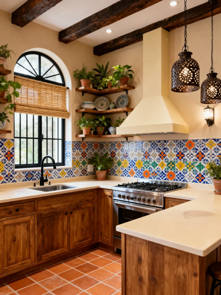 This kitchen is proof that you can have a “theme” without it feeling over-the-top. It leans into that beautiful Southwest or Spanish Revival aesthetic with the arched window and the exposed dark ceiling beams. The star here is definitely the multi-colored geometric backsplash. It’s playful and artistic, but the cream-colored countertops and range hood keep it from feeling chaotic.