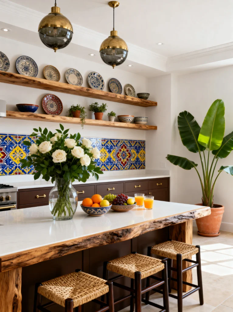 The brass globe pendants add a touch of “glam” that feels really intentional. It’s a great lesson in balance: you have the organic (the wood and the giant banana leaf plant), the traditional (the patterned tiles and plates), and the modern (the lighting and cabinetry). It’s bright, airy, and feels very “upscale coastal villa.” It’s the perfect inspiration if you want a clean look but can’t bear to give up your love for pattern and texture.