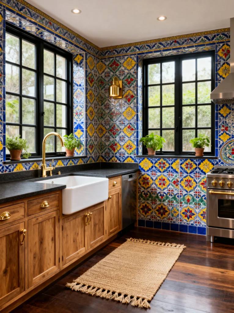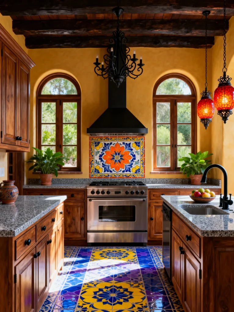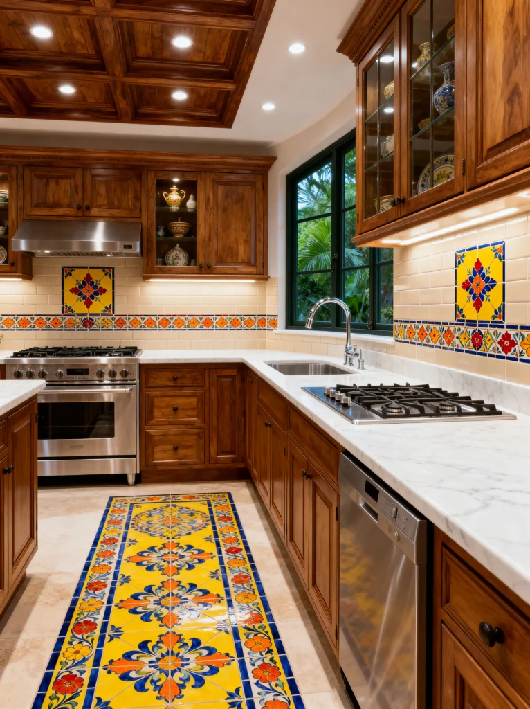 This kitchen is like a vacation in room form. It’s bright, airy, and full of traditional Spanish-inspired charm. The star of the show is the tile work. That vibrant yellow and blue runner made of tile built right into the floor? Absolute genius. It guides your eye through the space and adds a massive burst of energy.