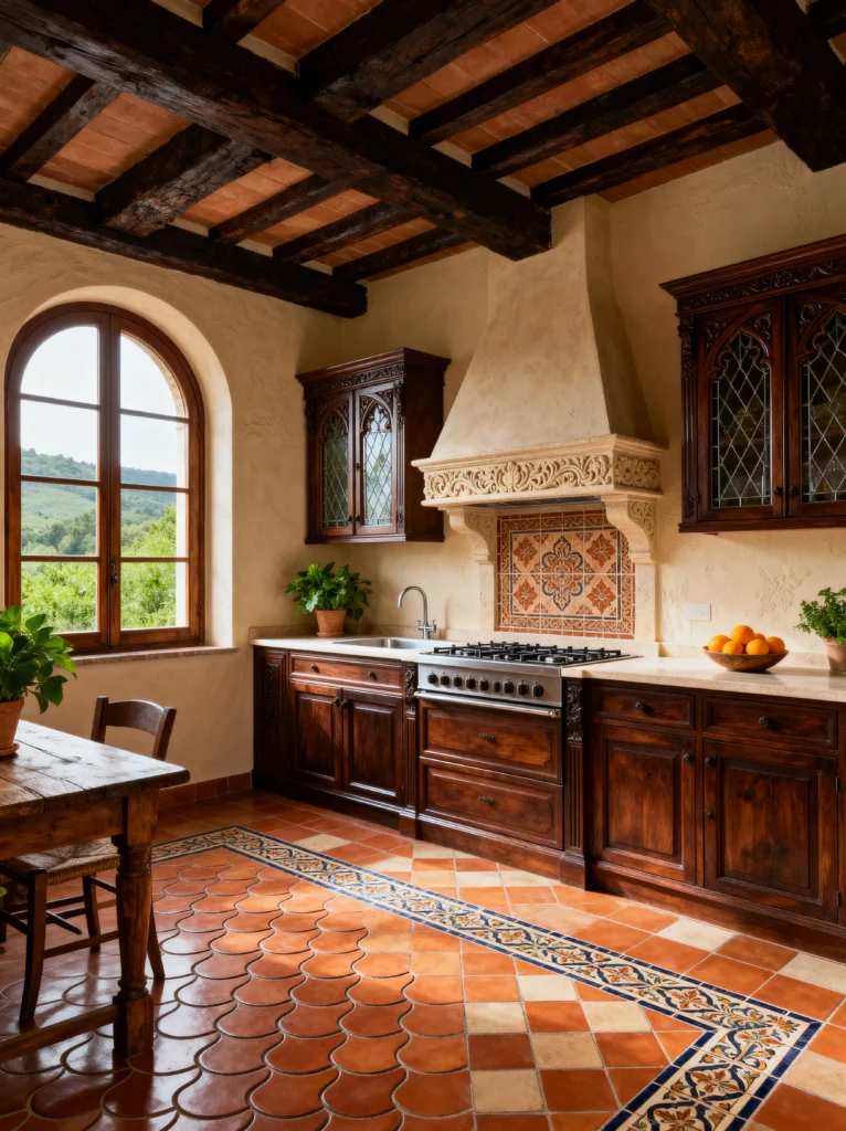 Finally, we have this breathtaking Tuscan-inspired masterpiece. This room is all about the architecture. From the “scalloped” terracotta floor tiles to the intricate stone carving on the vent hood, every inch of this space feels handcrafted. Those gothic-style arched cabinet doors with the leaded glass? Absolutely stunning.