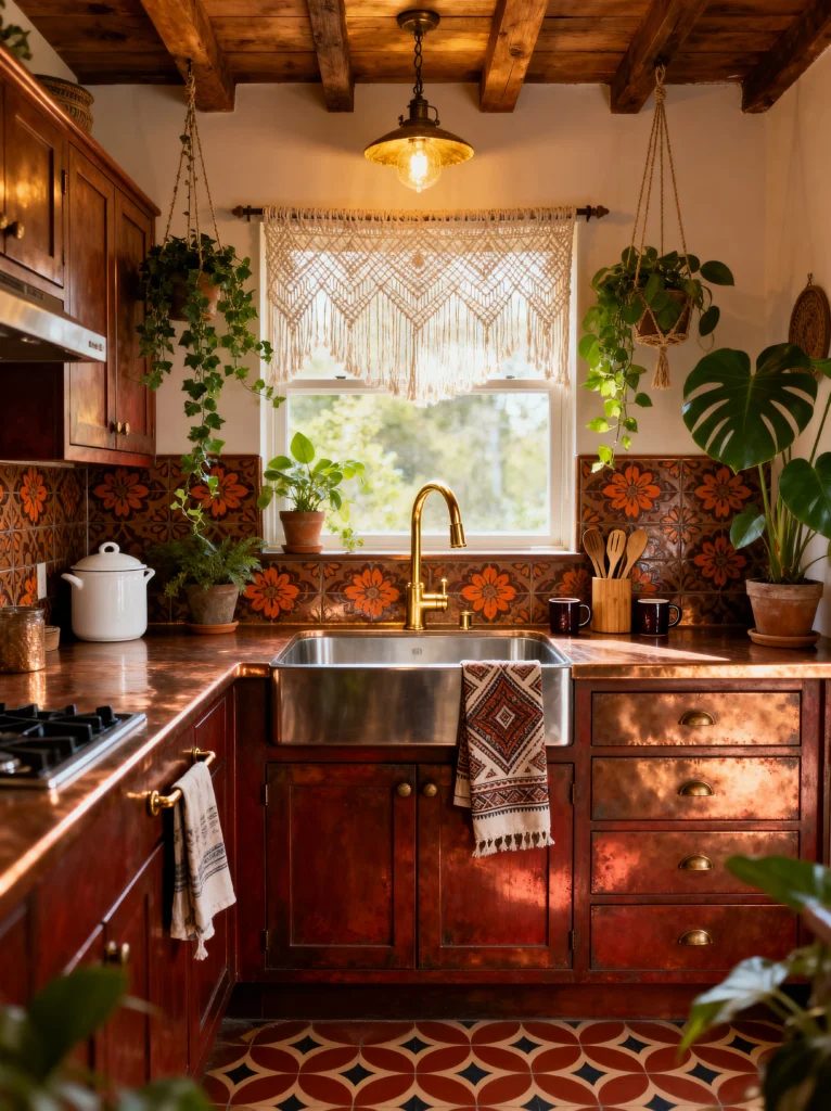 If I walked into this kitchen, I don’t think I’d ever want to leave. This is the definition of “cozy.” It leans heavily into a rustic, bohemian aesthetic that feels incredibly personal. The showstopper is definitely the copper countertop. It’s got that beautiful patina that only gets better with age, reflecting the warm glow from the overhead brass pendant.