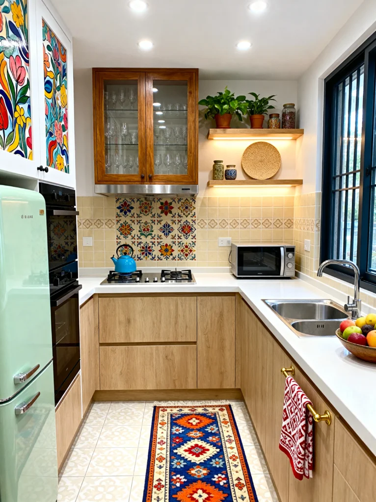 This kitchen is proof that you can pack a ton of personality into a smaller, more modern layout. It’s a “U-shaped” kitchen that uses every inch of space wisely. The light wood lower cabinets keep things feeling bright and open, while the upper cabinets are where the fun happens. Those floral, stained-glass-style cabinet inserts are such a cool, unexpected way to bring in color.