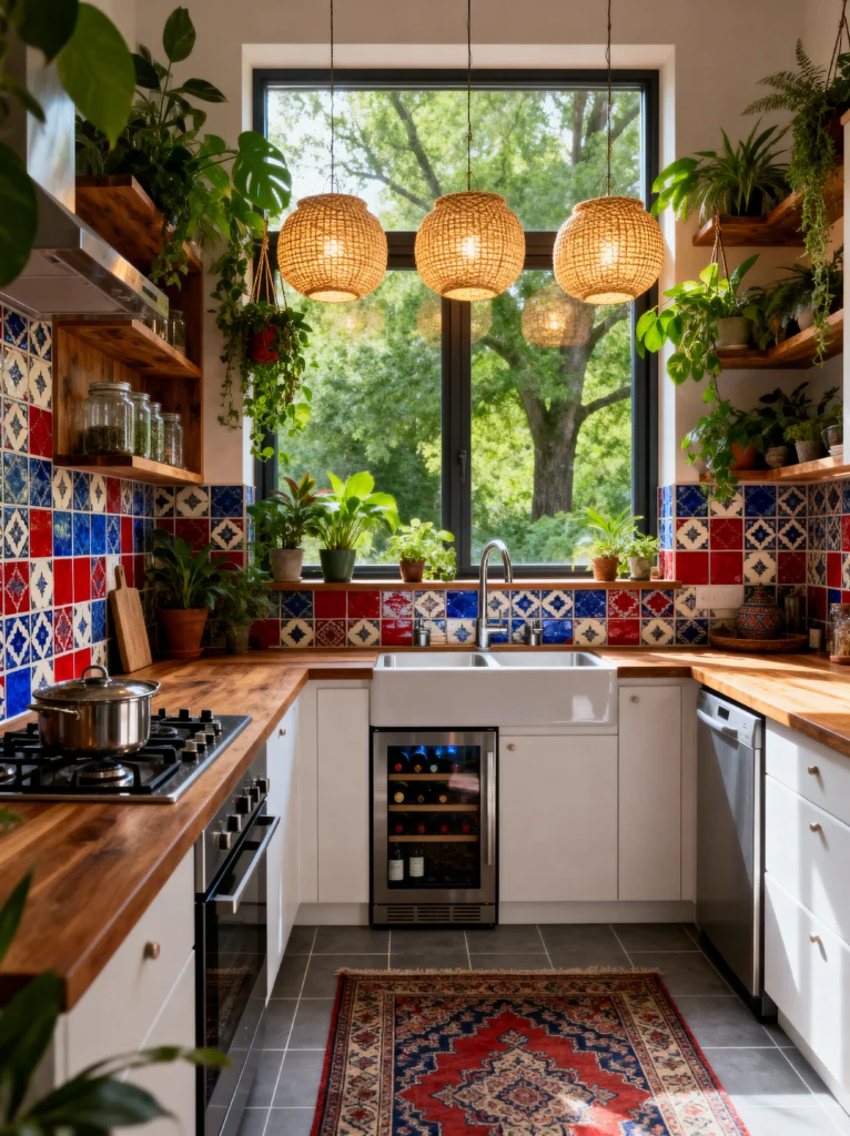 Even the little details, like the wine fridge tucked under the counter and the colorful Persian-style rug, add to the feeling that this is a space meant for enjoying the good life. It’s eclectic, it’s busy in the best way possible, and it’s full of life. It’s a great reminder that you don’t need a huge budget to make a space feel special—sometimes a few plants and some great tile go a long way.