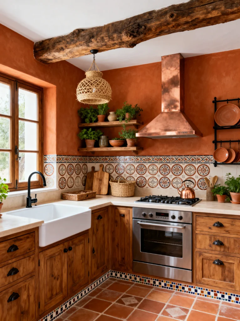 This is rustic charm done right. The combination of the heavy, rough-hewn wood beam on the ceiling and the polished copper range hood is just perfection. It’s that mix of “rugged” and “refined” that makes a space feel high-end but comfortable. The terracotta walls are a rich, warm backdrop for everything else.