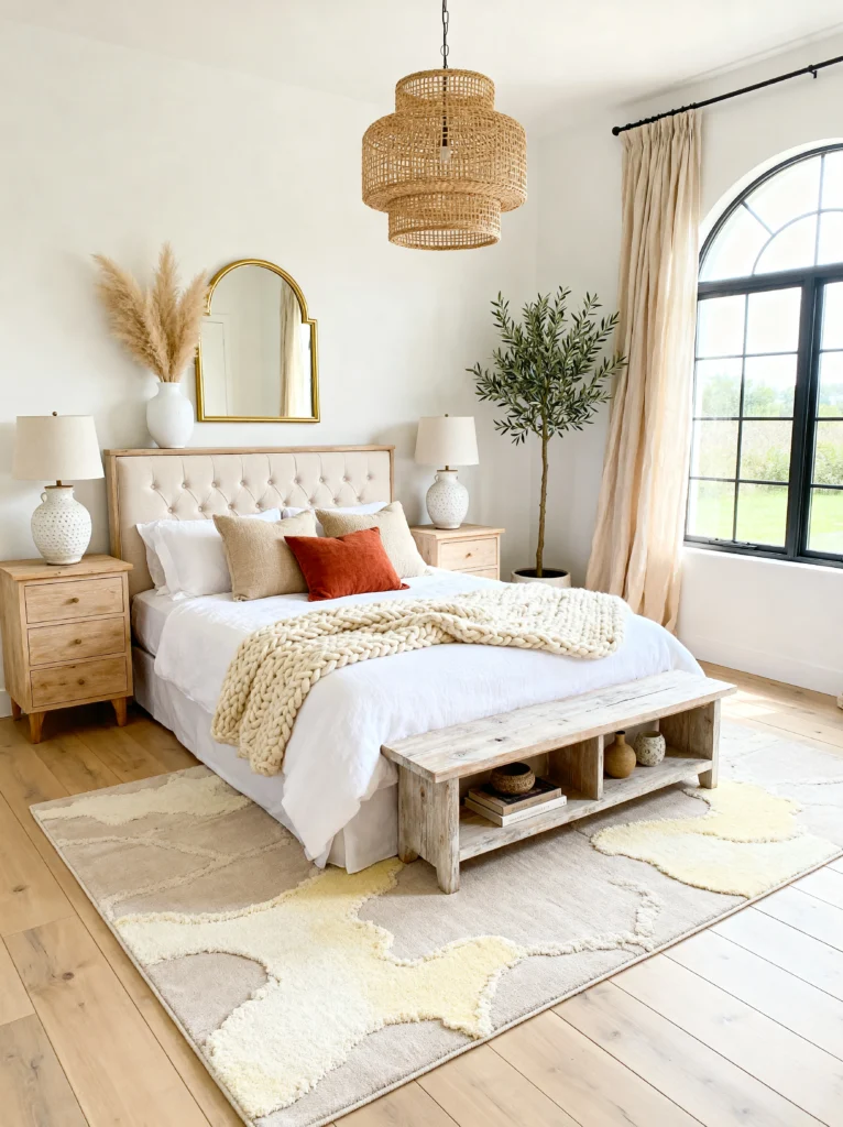 If you want your bedroom to feel like a high-end spa in the Mediterranean, this is your blueprint. The first thing you’ll notice is that gorgeous arched window—it lets in so much natural light that the whole room feels like it’s breathing. The color palette here is all about “quiet luxury,” sticking to creamy whites, soft beiges, and just a tiny pop of terracotta in that accent pillow to keep things grounded.