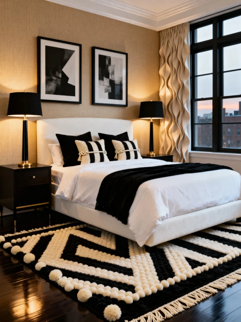 What I really love here is the play on shapes. You’ve got the sleek, tall black lamps standing next to a super plush, textured rug with giant pom-poms. It’s that mix of “sharp” and “soft” that makes a modern room feel livable. And check out those curtains! The wavy, sculptural fabric is such a cool alternative to standard flat drapes. It feels like a high-end hotel suite right in the middle of the city. It’s professional but definitely has a personality.