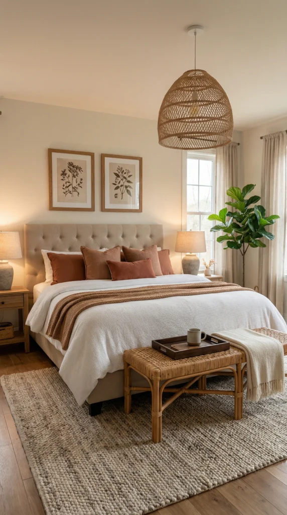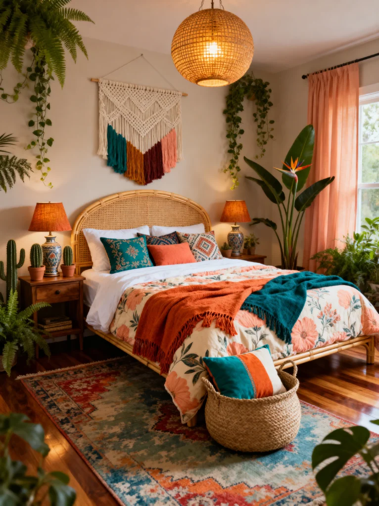 Ready to turn your room into a tropical getaway? This “Boho Jungle” vibe is all about warmth and life. The rattan headboard and wicker pendant light bring in those natural, earthy textures that define bohemian style. But the real star of the show here is the color palette—burnt oranges, deep teals, and soft corals mixed with a floral duvet.