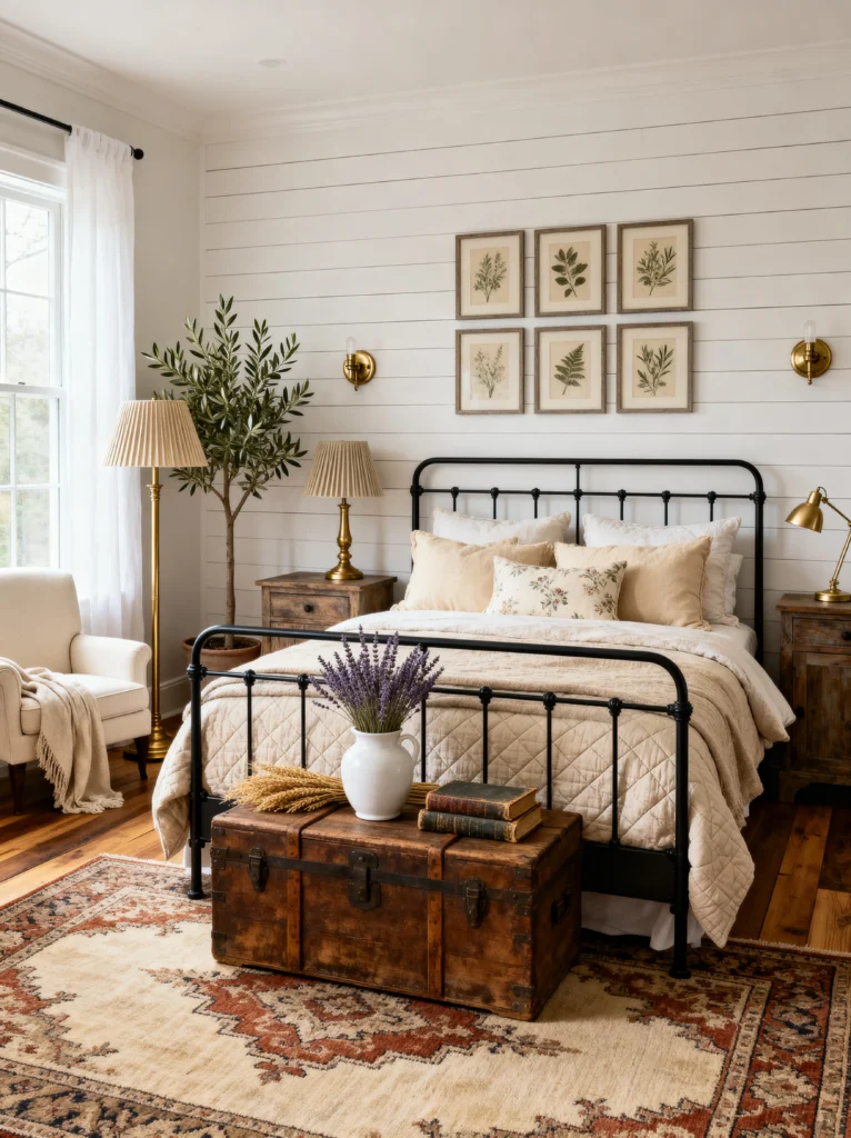 There’s something so timeless about a farmhouse-style bedroom. This look features a black metal spindle bed frame, which is a total classic. The shiplap walls provide a clean, horizontal texture that makes the room feel wider and more architectural. I love the “collected” feel of this space—the vintage-style wooden trunk at the foot of the bed looks like it has a hundred stories to tell.