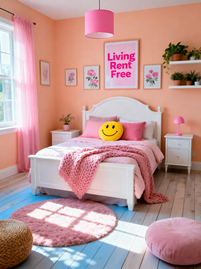Let’s be real: sometimes you just want to have fun! This room is a total mood-booster. If you’re obsessed with pink and “main character” energy, this is your blueprint. The peach-toned walls and bright pink accents create a space that feels youthful and energetic. The “Living Rent Free” poster is such a cheeky, modern touch that sets a playful tone immediately.