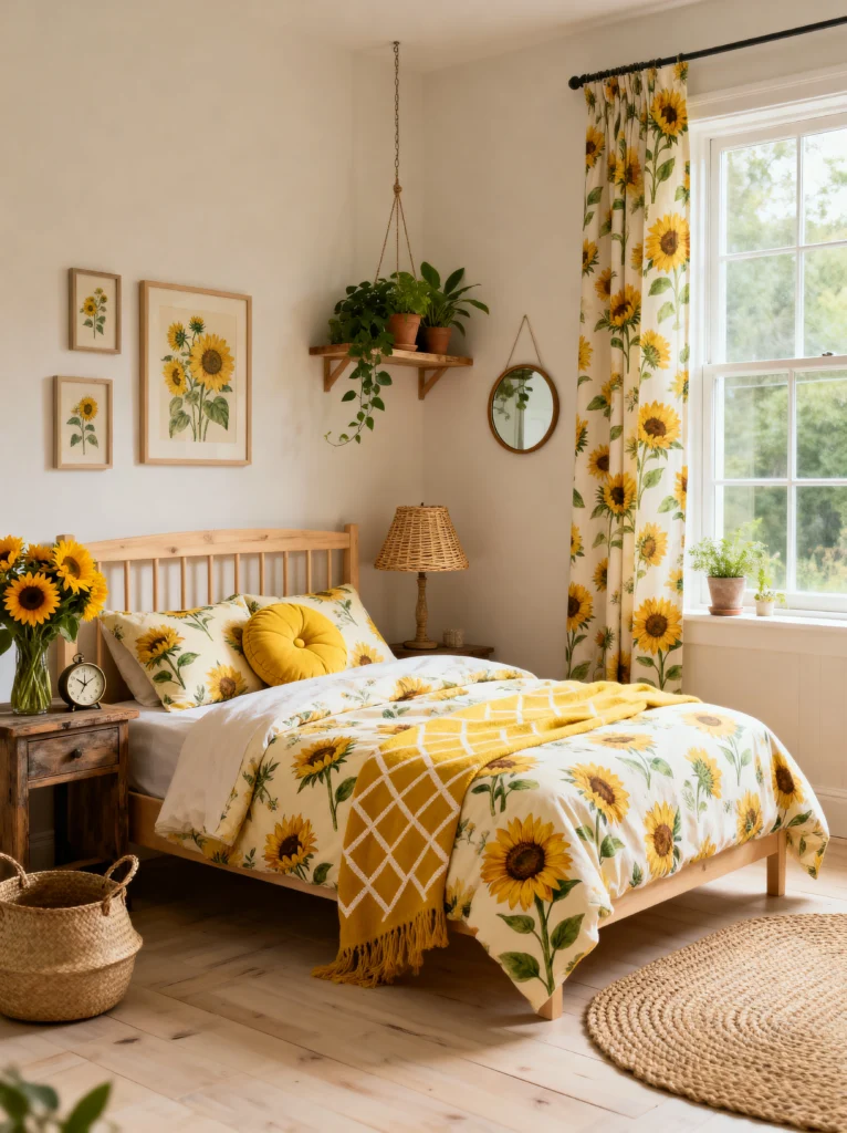 Is there anything cheerier than a sunflower? This room feels like a permanent summer morning. The use of yellow is so intentional here—from the floral bedding to the actual fresh sunflowers on the nightstand. It’s a very “cottagecore” approach to decorating, focusing on simple joys and natural beauty.