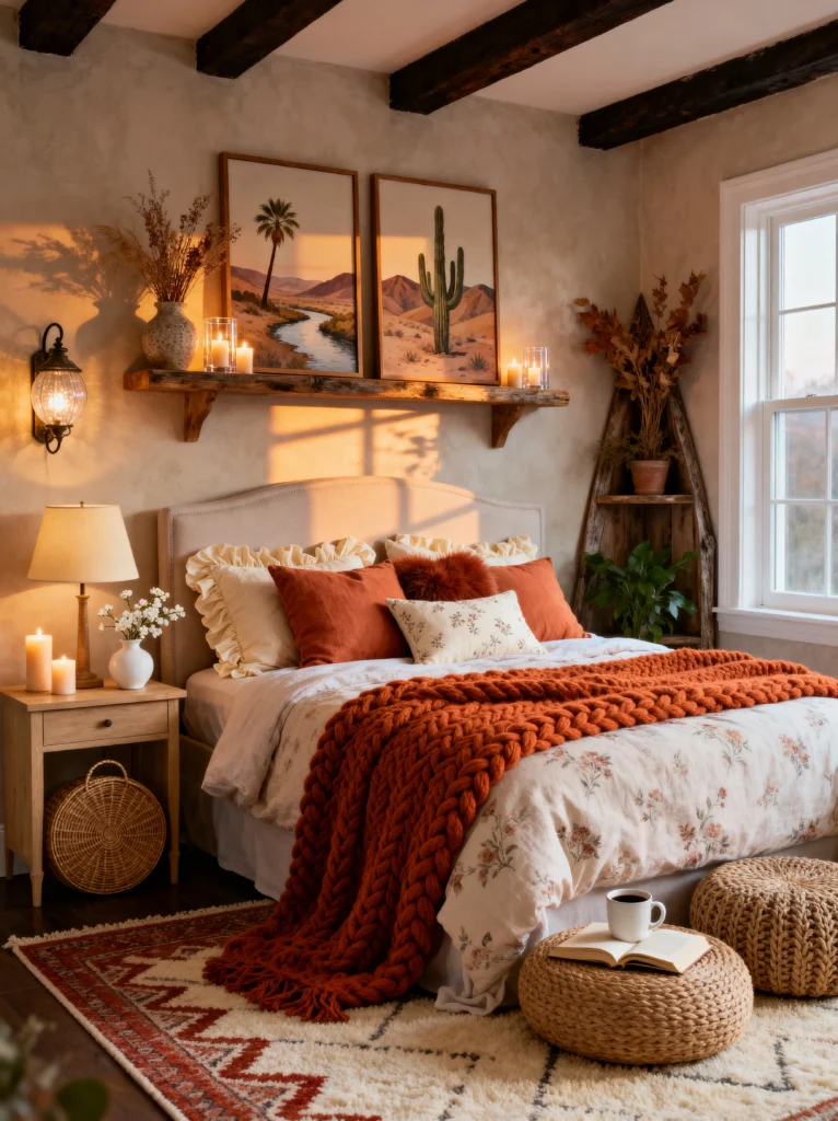 This room is all about that “Golden Hour” glow. The textured, sandy-colored walls give it an almost Mediterranean or Southwestern feel. The deep rust and copper tones in the pillows and that incredibly thick, chunky knit throw mimic the colors of a desert landscape. It feels incredibly warm and tactile.