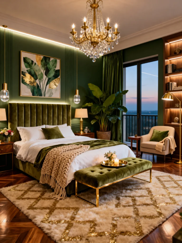 Finally, for those who want to live like royalty, we have this stunning emerald green sanctuary. This is “Maximalism” done right. The deep green walls and matching velvet headboard create a moody, expensive feel. When you pair that much green with gold accents—like the chandelier and the legs of the bench—you get instant glamour.