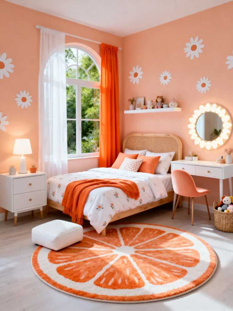 The daisy decals on the wall give off a very 70s-meets-modern-nursery vibe, but the furniture keeps it from feeling too young. That cane headboard is super on-trend, adding a natural element that balances out the bright, saturated oranges of the curtains and pillows. I also love the “sunflower” vanity mirror; the petal-like lights around it are such a clever way to bring in extra glow while sticking to the theme. This room is a masterclass in how to use a specific motif—in this case, citrus and florals—without it feeling overwhelming. It’s bright, it’s zesty, and it’s a total mood-booster. If you’re a morning person (or want to be one), this is the layout for you.