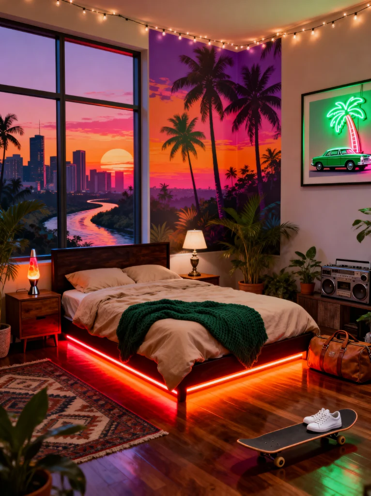 This room is basically a love letter to the 80s and Vaporwave culture. It is cool. If you want a bedroom that feels like a scene from a movie set in Miami, this is it. The most striking feature is the under-bed LED lighting. That neon orange glow makes the bed look like it’s hovering over the dark hardwood floors, which is such a futuristic touch.