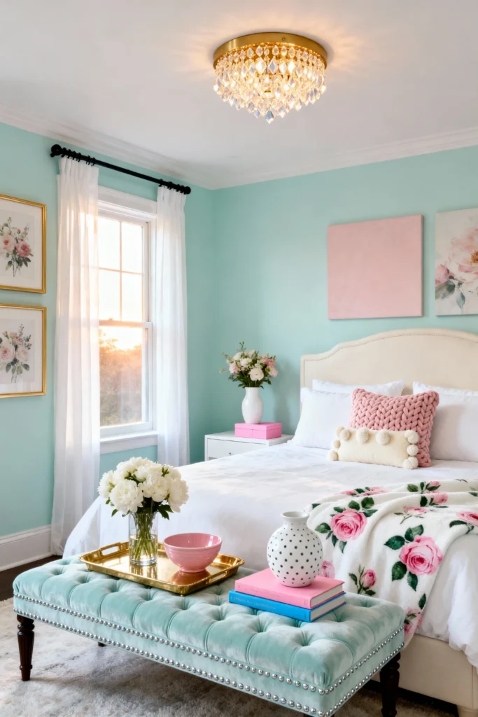 This is “Grandmillennial” style done absolutely right. The mint green walls are such a refreshing change of pace from the standard gray or white. It feels crisp and clean, like a cool breeze. The room uses “blush pink” as its primary accent color, which is a classic pairing with mint, but the way it’s used here—in the knit pillows and the floral blanket—makes it feel sophisticated rather than sugary.