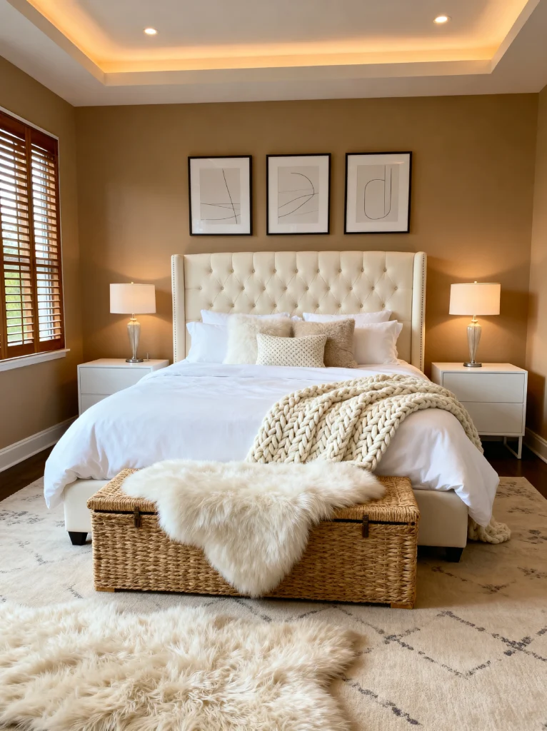 You have a tufted wingback headboard, a chunky knit throw, a woven wicker chest at the foot of the bed, and a super-plush faux fur rug on top of a patterned carpet. By layering all these different materials, the room feels rich and “expensive” even though the colors are simple. The tray ceiling with recessed lighting gives the whole space a soft, ambient glow that feels very high-end. This is a very sophisticated, “adult” bedroom. It’s clean, it’s organized, but it’s also incredibly inviting. It’s the perfect layout for someone who wants a calm, neutral environment that still feels cozy and lived-in.